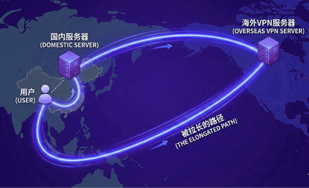 结果就是,不管你是在刷外网,还是在用一个完全不需要翻墙的国内 App,所有网络请求都会先跑到 VPN 服务器,再绕一圈回来。