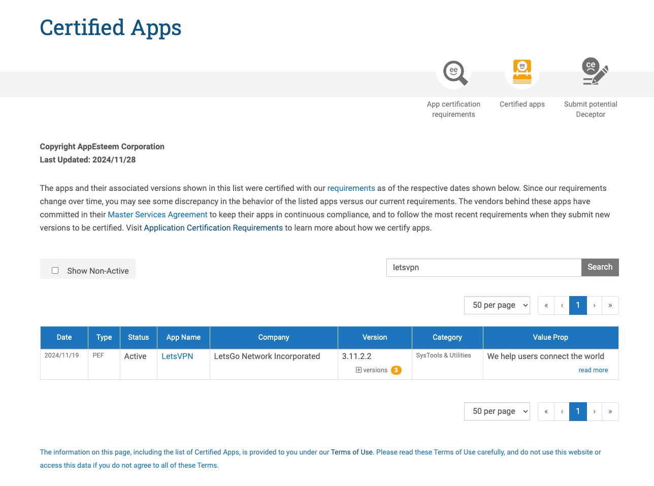 那么在哪里可以看到 AMTSO 的认证呢,我们可以通过 AppEsteem 官网查看,它的官网有一个"红黑榜",详细列出了安全软件和欺诈软件列表,你可以在这里搜索自己要安装的软件是否在黑红榜中,比如这里通过搜索可以发现快连 VPN 已经在其安全软件列表中